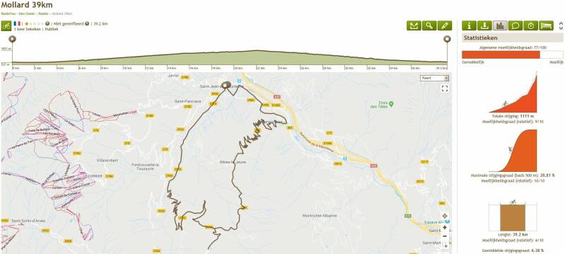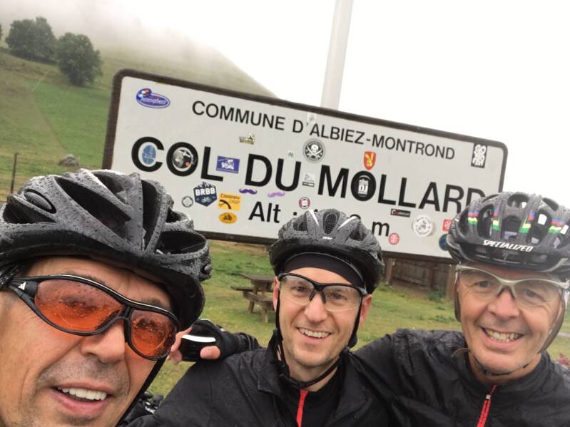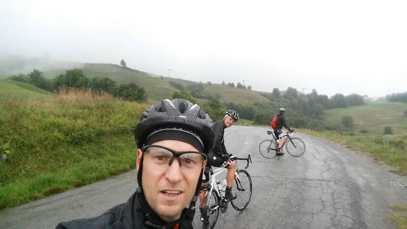 We moeten hier op de top zelfs nog even gaan schuilen omdat het steeds harder begint te regenen. We overleggen samen wat we gaan doen en besluiten wijselijk om niet verder omhoog te klimmen naar de Croix de Fer en Glandon. Het is met knikkende knieën, en neen niet alleen van de kou ondertussen, maar met een ei in mijn broek van de schrik dat we aan deze afdaling gaan beginnen. Omdat het al zo hard heeft geregend blijken mijn remmen niet zo goed meer te werken dus daal ik voorzichtig doch met de daver op het lijf deze zeer technische afdaling af richting het dal. We nemen nu de andere kant rechtstreeks naar Saint-Jean-de-Maurienne. Gelukkig is het onderste gedeelte meer rechttoe rechtaan zodat ik niet te veel meer hoef te remmen. Of neen, toch niet! Ik moet, samen met mijn fietsmakkers, nog 1 keer vol in de remmen op een lang recht stuk. Omdat er een versmalling is wegens werkzaamheden en van de tegenovergestelde richting een grote vrachtwagen ons tegemoet komt met enorme snelheid kunnen we een fatale aanrijding maar op het nippertje vermijden. Amai, dat scheelde echt niet veel. En als ze willen, werken mijn remmen precies toch nog voldoende! Voor de rest laten we ons rustig zachtjes bergafwaarts voeren richting het centrum van Saint-Jean-de-Maurienne. En kunnen we deze nu al legendarische rit afsluiten van 40km met 1100hm.