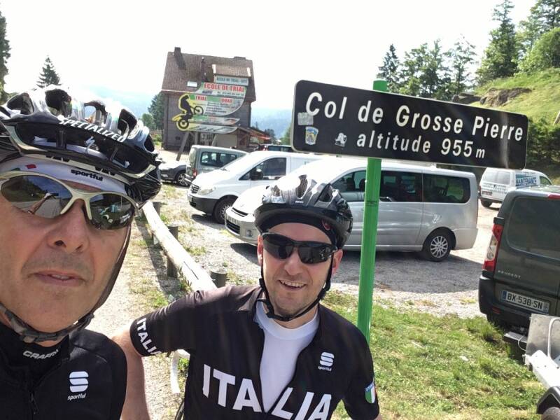 Na deze eerste klim volgt een zeer steile afdaling naar La Bresse. Vermits ik als eerste de afdaling inzet kijk ik tijdens het dalen regelmatig achterom om te zien of mijn kompaan nog volgt. Maar na een scherpe bocht merk ik dat dat niet meer het geval is en besluit ik wijselijk om te stoppen. Ik zie uiteindelijk iemand per fiets van achter de bocht komen maar het blijkt om iemand anders te gaan. Die persoon probeert in zijn beste Italiaans uit te leggen dat mijn fietsgenoot is gestopt! Zouden onze Italia tenues er voor iets tussen zitten? Enfin, ik fiets een beetje terug omhoog en zie dan dat Johan eindelijk op zijn gemakske van achter de bocht komt. Blijkt dat hij zijn fiets niet meer onder controle kreeg door de felle zijwind die in zijn wielen met duidelijk veel te hoge velgen sloeg. De rest van de afdalingen zullen we dus voorzichtig moeten aanpakken. Nadat we La Bresse zijn gepasseerd kunnen we aan de 2de beklimming beginnen. Deze korte maar zeer steile klim gaat naar de Col du Brabant met een mooi uitzicht over La Bresse.