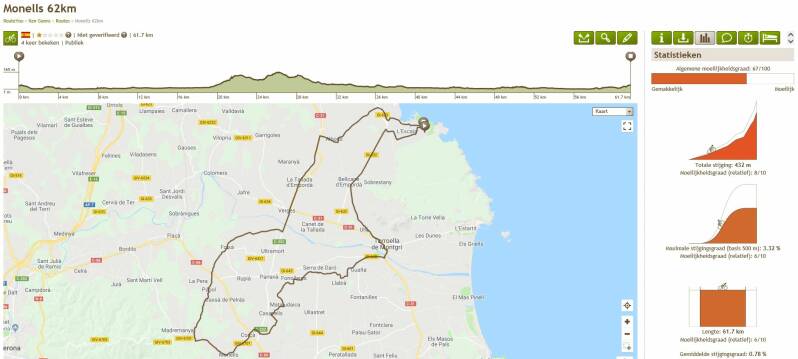 Nu, zonder mountainbike, moet ik dus verplicht rond het natuurpark rijden via de geasfalteerde baan via Bellcaire d'Empordà terug naar L'Escala. Ik moet dit laatste stuk nog stevig op de trappers duwen wegens een strakke wind op kop vanaf de kust. Dit 2de ritje hier is goed voor 62km en 530hm.