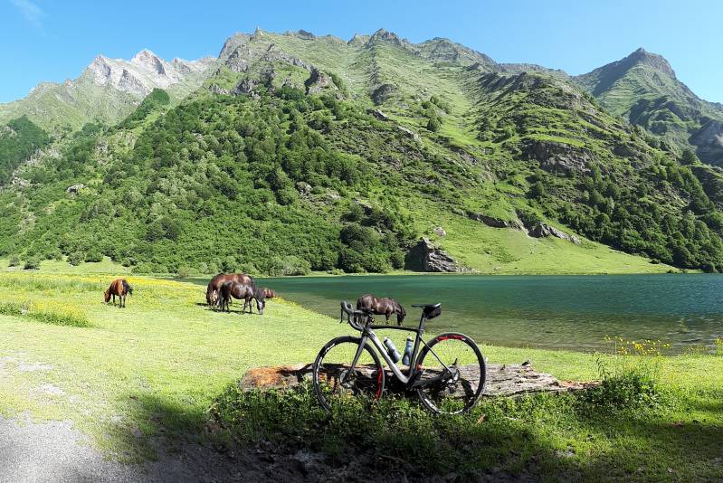 Sorry voor de foto overload, maar het is hier buitenaards mooi. Je kan dan ook niet genoeg foto's nemen en dan nog doe je deze omgeving er onrecht mee aan. Met de paarden en koeien die dan ook nog eens lekker liggen te genieten van het zonnetje en zich verfrissen in het koele water van het meer. Ik zou hier dan ook nog uren kunnen spenderen om te genieten van deze mooie setting. Maar we moeten verder. Dus dalen we terug via dezelfde weg af tot in het dorpje Estaing waar we nu wel afslaan naar de beklimming van de Col des Bordères. Normaal geen moeilijke beklimming, amper 2km klimmen, maar wel aan 9% en 10%. En omdat het verschrikkelijk warm is toch nog best lastig dit kleine puistje. We stoppen natuurlijk nog even voor wat foto's voor de statistieken hé!