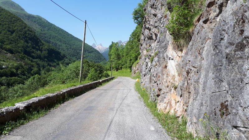 We rijden de top over en dalen af langs de andere kant. Ook steil hier en bijna dubbel zo lang, gelukkig dat we de rit in deze richting hebben gedaan, bedenk ik mij dan maar. We komen in de 'Vallée d'Arrens' iets voorbij de beklimming naar de Soulor. Wij gaan linksaf en mogen meteen een klein muurtje over van 10%. Daarna vlakt het gelukkig wat af en rijden we over een rollercoaster stuk constant op en af langs de rotsen.