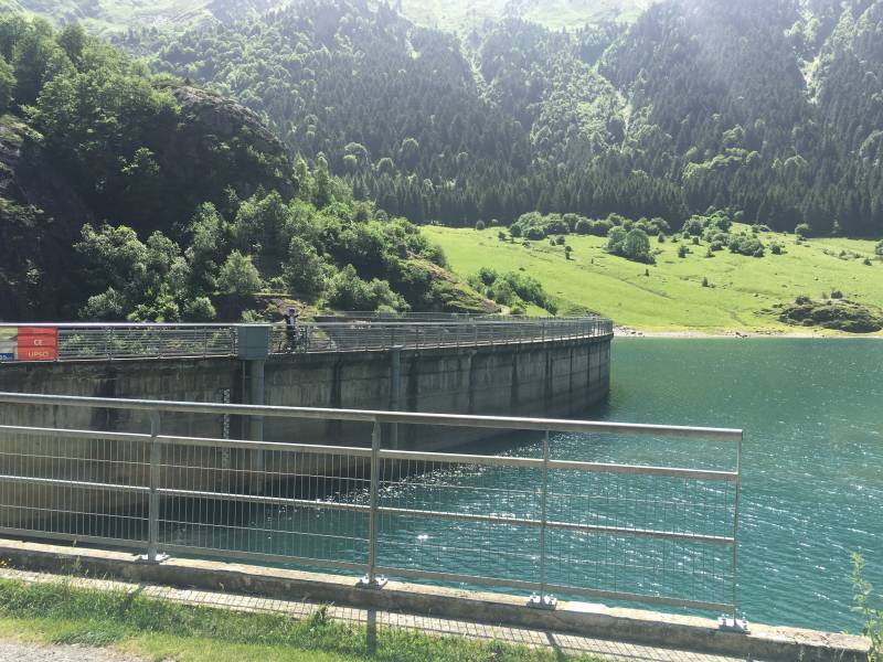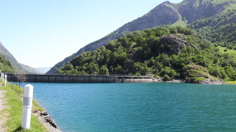 Na dit mooie, vlakkere gedeelte gaat het weer steviger omhoog. Gedurende 2km eerst aan 7% en daarna zelfs 8%. Zo komen we uiteindelijk aan het tweede meer, met stuwdam, genaamd Lac du Tech. Ook hier is het weer ongelooflijk prachtig. De knalblauwe hemel, de hoge nog met sneeuw bedekte bergpieken in de verte en dan het blauwgroene water van het meer. Fantastisch gewoon. Dit is echt genieten. Ook hier worden weer de nodige foto's genomen.