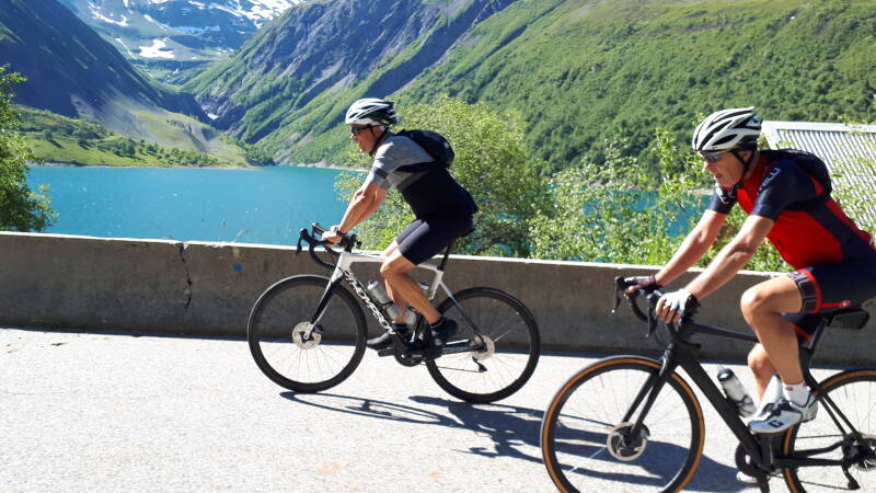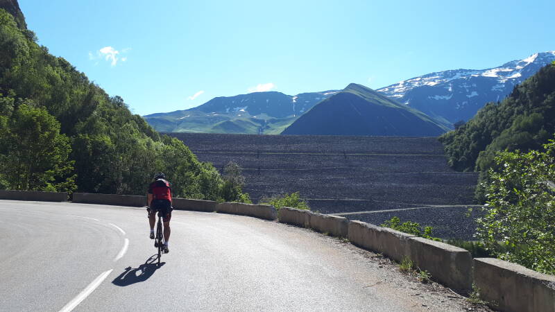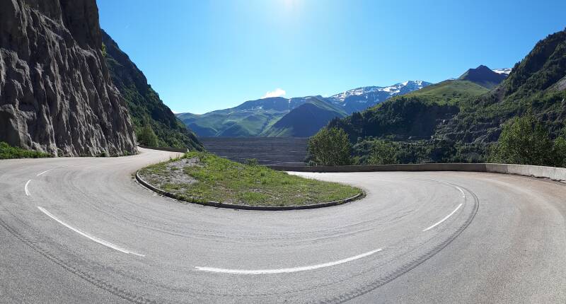 Het eerste gedeelte gaat gestaag omhoog met weinig mooie zichten. Dan krijgen we 2 steile kilometers voor de wielen aan dik 10% gemiddeld. We hebben tot nu toe nog geen enkele haarspeldbocht tegengekomen. Maar dan wanneer het wat afvlakt dienen zich de eerste bochten zich aan maar wel in een afdaling dan nog. Dus aan een deel van de reeds overwonnen hoogtemeters kunnen we opnieuw beginnen. Gelukkig opent het landschap zich nu meer en krijgen we een mooie vallei te zien waar we doorfietsen. En na een paar bochten krijgen we zicht op een dam met daar achter een fantastisch mooi en groot meer, Lac de Grand Maison! Omdat we hier volledig langs fietsen is het nogal moeilijk om dit mooi in één foto vast te leggen.