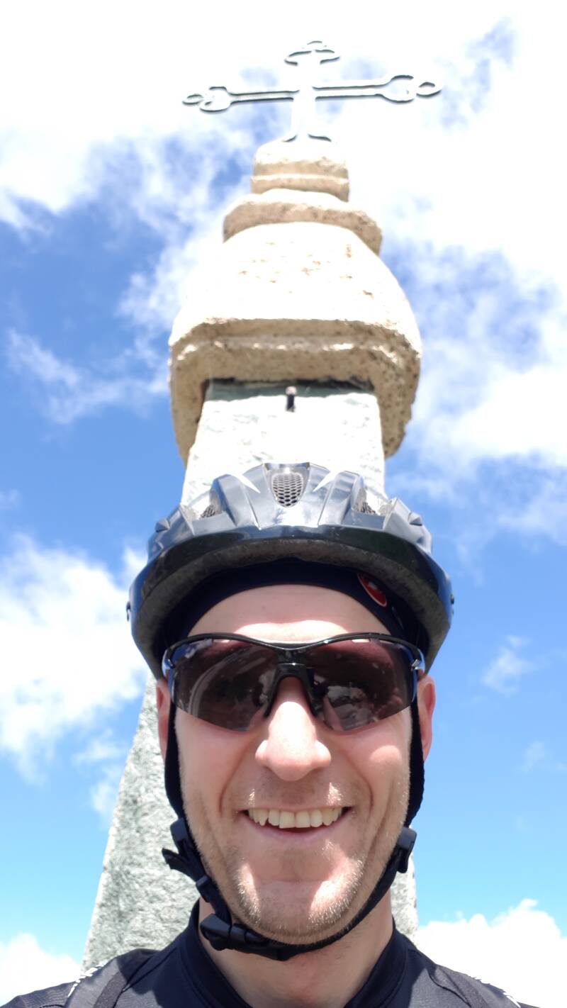 Ook gaan in dit 2de gedeelte de stijgingspercentages weer ferm de hoogte in. Ik begin echt door mijn laatste krachten heen te geraken. Moet meermaals stoppen en zelfs enkele keren mij echt aan de kant zetten een klein beetje beschutting zoekend in de weinige schaduw die er te vinden is. Beide drinkbussen zijn nu echt zo goed als leeg, heb zelfs geen energierepen meer over en moet er ene lenen van Johan. De percentages gaan in de laatste bochten niet meer onder de 10% maar uiteindelijk bereik ik toch nog de top maar hoe weet ik eigenlijk niet. Gelukkig is er een klein barakske waar ze wat snoepgoed en drinken verkopen. Nog nooit zo blij geweest met ne Snickers en ne Cola! Gelukkig gaat het bij mij allemaal zoetjes binnen, Johan zijn lichaam neemt echter niets meer op. Dat belooft seffens voor de afdaling. Maar eerst toch maar zien dat we die foto's kunnen nemen voor de statistieken. Check!