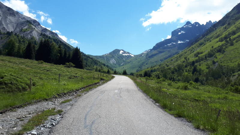 Weer bijna 20km lang en nu tot net onder de 2000m hoogte. Omdat het al een stuk in de namiddag is en de zon pal in het zenit staat geen makkelijke opgave. Al zeker niet omdat die hoogtemeters van de Croix de Fer al in de benen zitten. Bon we beginnen er toch vol goede moed aan. Eerst nog een aantal kilometers vlak inrijden langs het water richting Saint-Étienne-de-Cuines waar de voet ligt van deze beklimming. De eerste kilometers weer gematigd rechtdoor naar boven zonder al te veel bochten. Halverwege, na ongeveer een uurtje klimmen, komen we in een dorpje waar het gelukkig terug wat vlakker loopt. Mijn drinkbussen beginnen al stilletjes aan terug op te geraken maar waarschijnlijk mede door corona geen enkel winkeltje of restaurantje dat nog open is. Dat wordt een lastig tweede gedeelte.