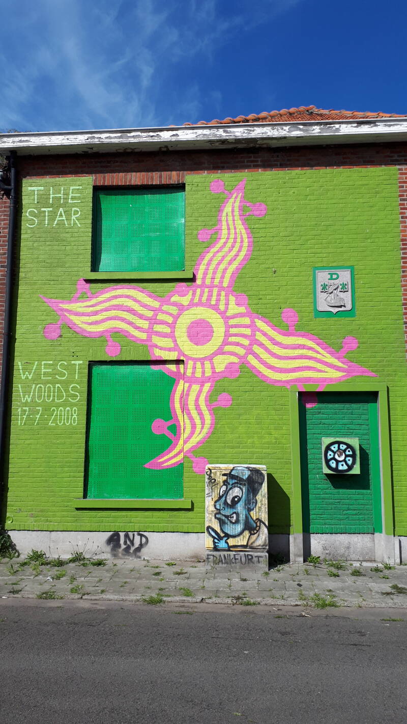 Het duurt echter nog een tijdje eer we op onze eindbestemming zijn. Eerst maar eens zien dat we door dat spookdorpje kunnen geraken. Want 's avonds en in het weekend worden de toegangswegen afgesloten wegens vandalisme en graffiti. Maar wij kunnen er overdag in het weekend gelukkig gewoon naartoe met de fiets. Toch wel een speciale setting zo'n half verlaten dorpje waar de meeste huizen niet meer bewoond zijn. Die zijn gelukkig ondertussen afgesloten met metalen panelen voor de ramen. De graffiti artiesten kunnen er hun talenten op showen. Maar ik denk niet zo aangenaam voor de paar mensen die er nog wel wonen. Enfin, tijd voor wat foto's dus.