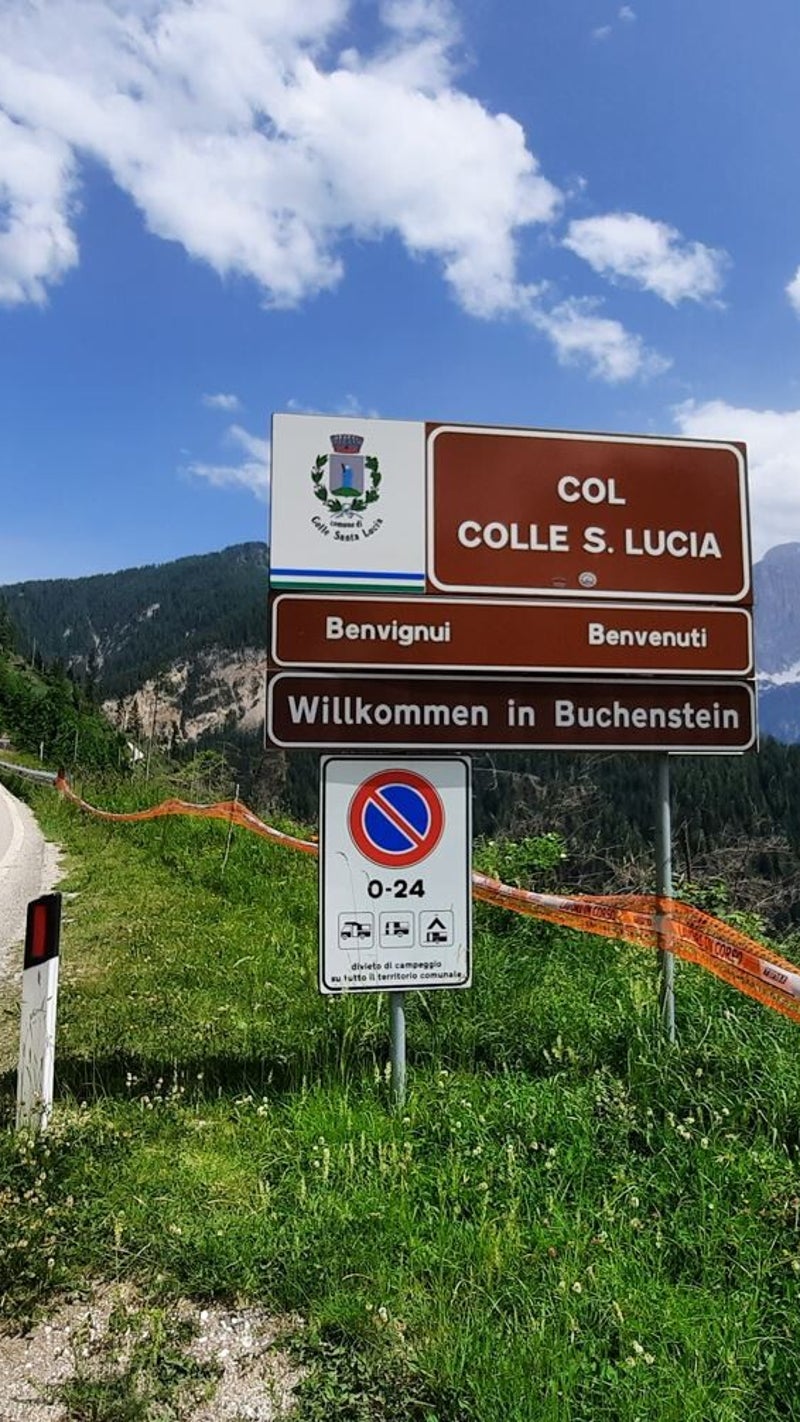 We doen het op't gemakske vandaag met regelmatige tussenstops voor wat foto's. Na iets meer dan 1u fietsen staan we toch al op de top van deze eerste Passo van de dag. Buiten het naambord is er ook een soort van gedenkplaat/steen met alle namen van wielrenners die hier als eerste gepasseerd zijn tijdens de voorbije Giro d'Italia's. Altijd leuk zoiets voor wat foto's. Na de top volgt een heel lange weer kronkelige afdaling helemaal tot in Canazei. We zijn ondertussen al 2u onderweg en besluiten hier even iets te gaan drinken. Het wordt tenslotte nog een lange dag en het is al redelijk warm. We zetten ons op het terras van Café La Petite terwijl we naar een downhill event kijken dat hier momenteel aan de gang is.